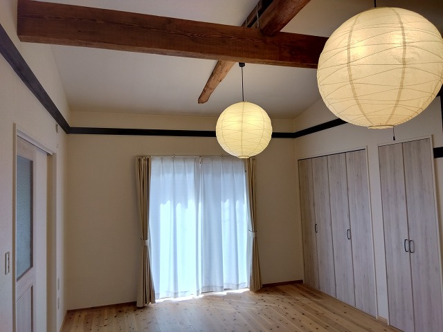 1階洋室12帖 梁と照明がおしゃれ エアコン付です